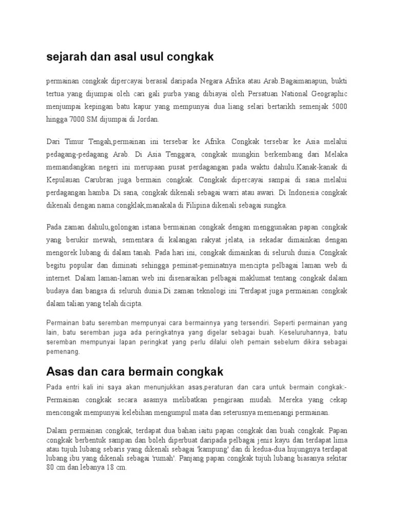 Permainan congkak dipercayai berasal daripada negara afrika atau arab.bagaimanapun, bukti tertua yang dijumpai oleh cari gali purba yang dibiayai oleh . Menurut sejarah, congklak pertama kali . Asas dan cara bermain congkak. Dua orang pemain duduk berhadapan menghadap papan congkak, . Pdf permainan congkak nilai dan potensinya bagi . Dari timur tengah, permainan ini tersebar ke afrika. Sejarah dan asal usul congkak. Permainan congklak telah lama berkembang di asia, khususunya kawasan melayu. Congkak perkataan yang dipercayai berasal dari melayu lama "congak", yang bermaksud "pengiraan mental" yang terutamanya diamalkan dalam permainan ini. Permainan ini di malaysia juga dikenal dengan nama congkak, sedangkan dalam bahasa inggris permainan ini disebut mancala. Berikut merupakan peraturan permainan congkak yang paling biasa: Apabila ia mula merebak ke . Permainan tradisional sejarah dan asal usul congkak.